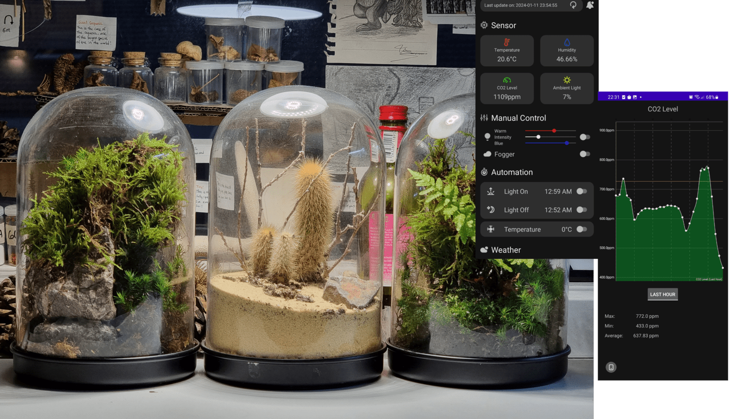 The Biosphere is a smart terrarium controlled using MQTT over the internet with an Android application. It monitors temperature, humidity, CO2 level, and the lights and fogger can also be controlled from the app. I am currently working on it, and here is a preview.