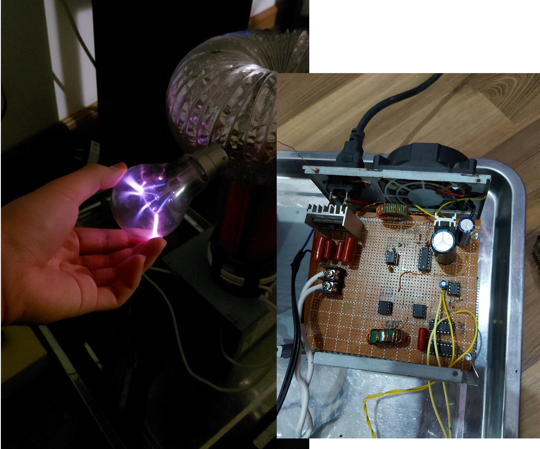 The Tesla Coil is a high voltage device invented by Nikola Tesla. This modern implementation works on the same principles, but uses MOSFETs for switching. It can light up bulbs wirelessly and even play music from its arcs.